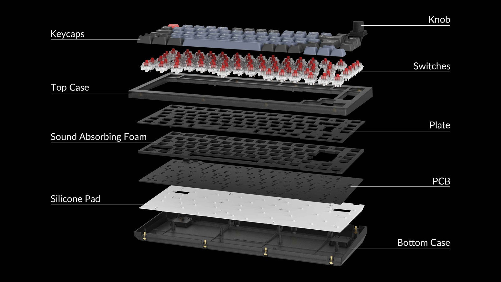 The hot-swappable sockets are mounted on the PCB. so you can install or change the switches without soldering. The PCB supports both 3-pin and 5-pin MX mechanical switches.